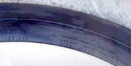 ยางเส้นนี้ถูกใช้จนดอกยางสึกลง ไปเท่ากับสันนูนในร่องยาง (บน)