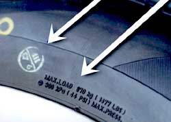ซ้ายเป็นหมึกปั๊มที่มีเฉพาะยางบางรุ่น ขวาเป็นตัวเลขรับน้ำหนักบรรทุกสูงสุดของยางแต่ละเส้น และแรงดันลมยางสูงสุดที่ยางรับได้